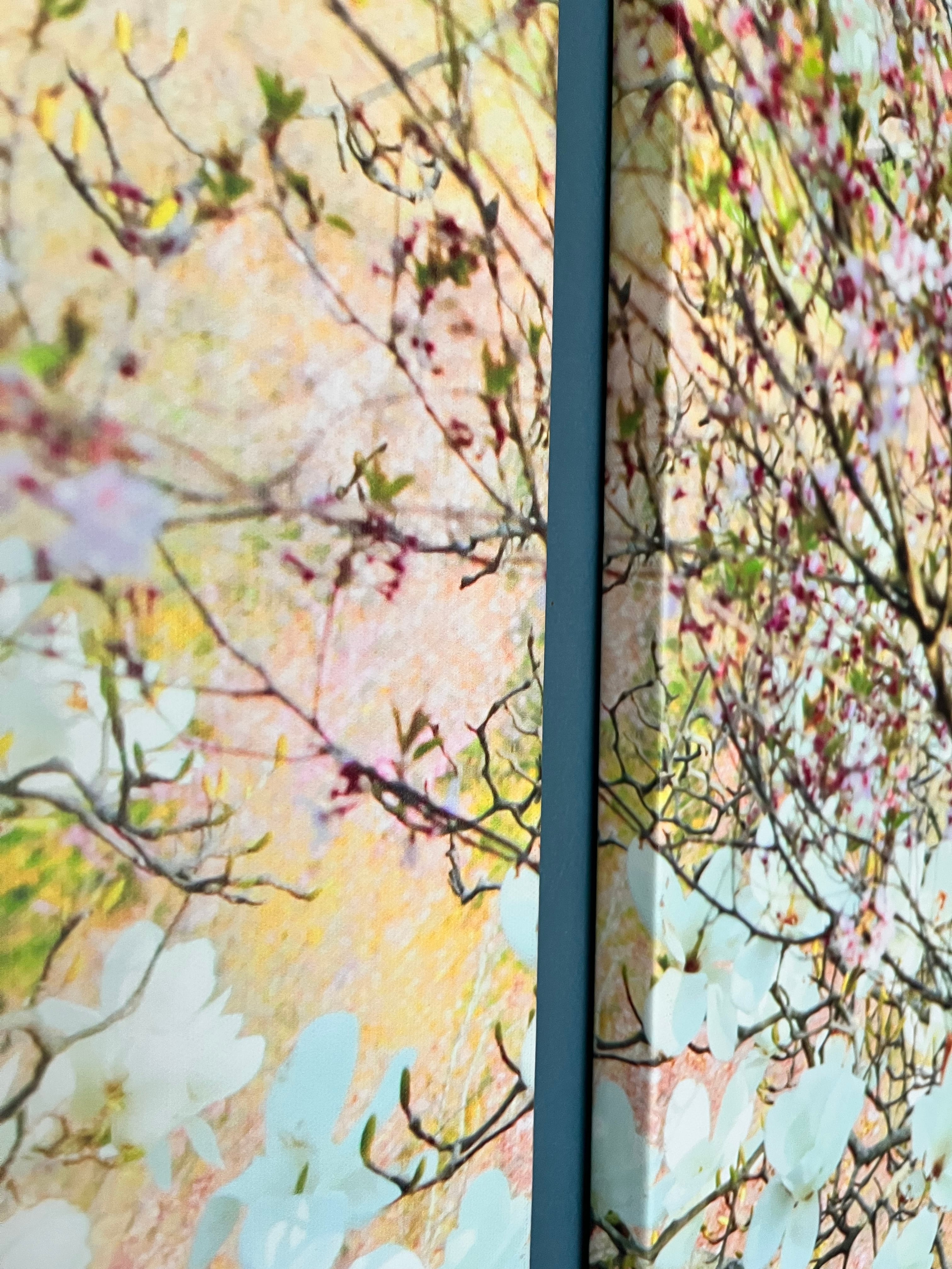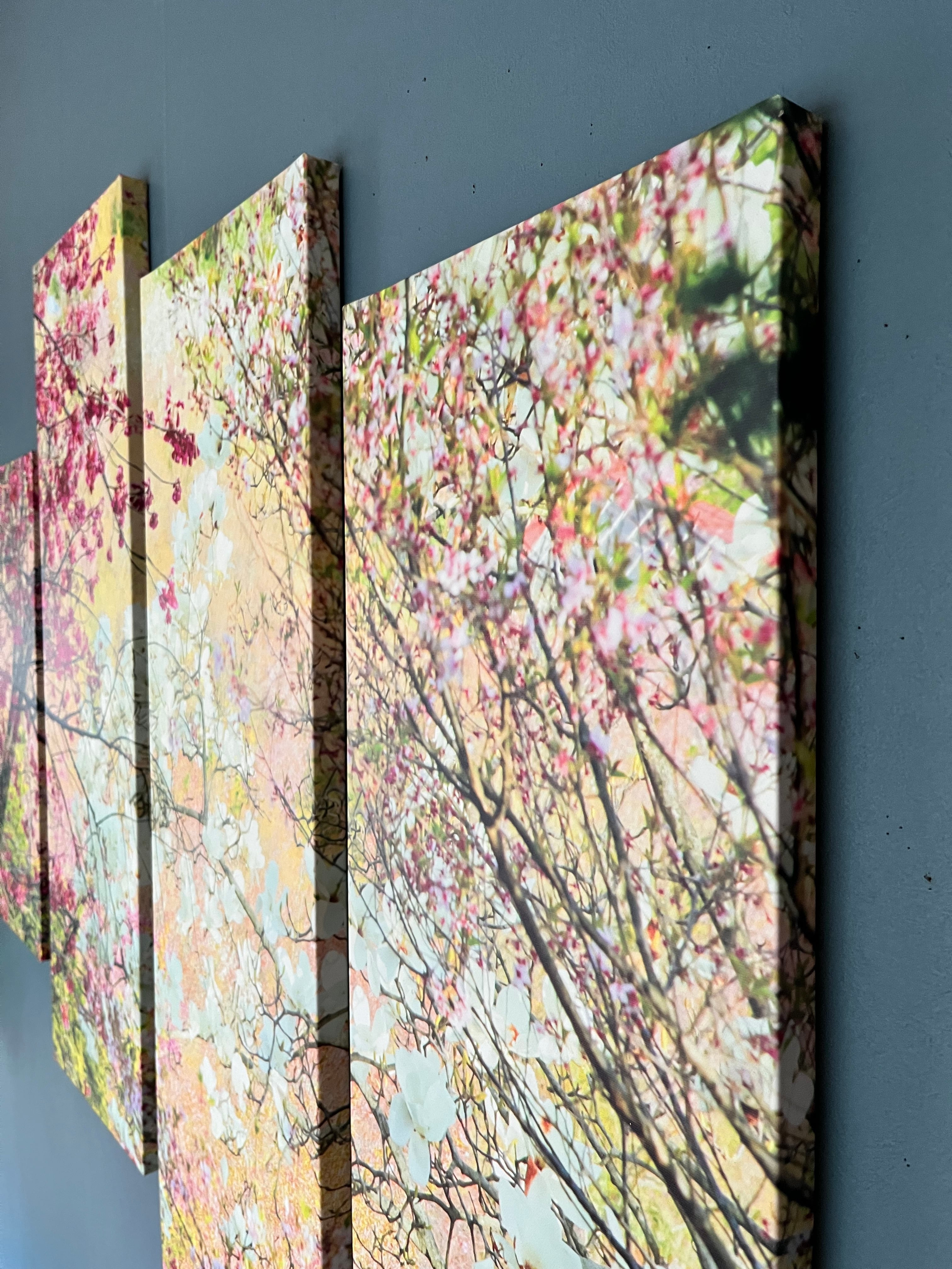 ウメ・レンギョウ・トウカイザクラ・ボケ・ソメイヨシノ・ハナモモなどの花々が一斉に咲き誇り、山全体が淡いピンク色に染まっている。まさに桃源郷!感動とともに空に向かってシャッターを切ったら、いつの間にか涙が。そんな感動を4枚のパネルに分割した、おしゃれなスタイルで仕上げてみました。側面にも写真がプリントされているので、180度どこからも楽しめます。